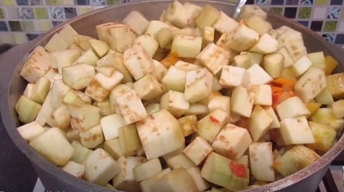 - Наріжте овочеві компоненти кубиками. Обсмажте баклажани, перекладіть в каструлю.