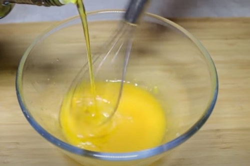 - Не перестаючи інтенсивно збивати масу, влийте потихеньку обидва види оливи. Після того, як заллєте чверть усієї кількості масла, можна підливати великими порціями.