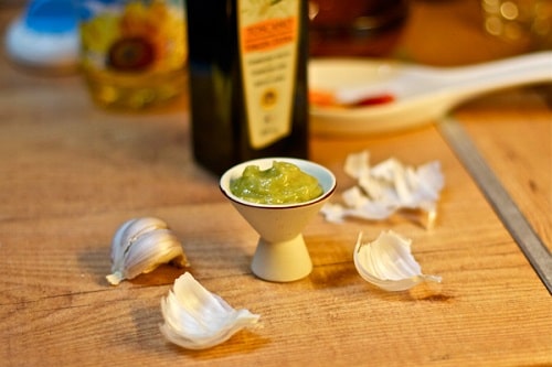 Перетворіть в кашку чубчики часнику. Можна зробити це в ступці, по-старому, або розчавити спеціальним пресом. Щоб часник легше давився, киньте в ступку дрібку солі. На перетирання часнику не шкодуйте часу, нехай пустить більше соку.