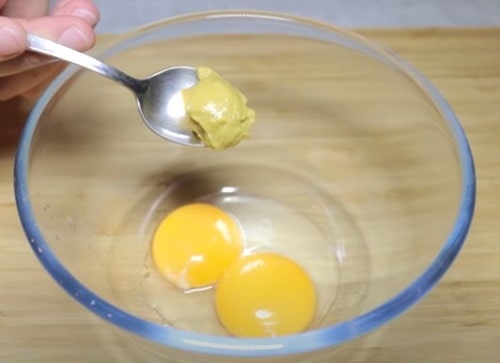 - Окремо збийте жовток з гірчицею.