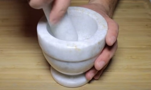 - Очистіть головку часнику. Розітріть в ступці, закладаючи по кілька зубчиків. Підсолити, тоді перетирати часточки стане легше.