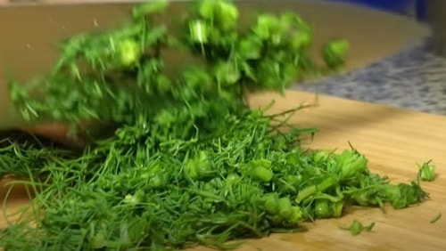 - Дрібно поріжте гілочки зелені, додайте в миску.