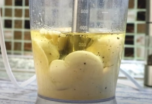 Залийте трохи олії. Почніть збивати блендером на самій малій швидкості – в цьому фішка правильного збивання, якщо хочете отримати на виході густий соус.