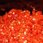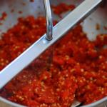 Через три хвилини потрібно додати воду і продовжувати варити на середньому вогні, помішуючи 20 хвилин. Коли перець стане м’яким і вся вода випарується, то потрібно завершити підготовку. Перець може обпалювати очі під час варіння, тому готувати його потрібно в провітрюваному приміщенні. Готова суміш знімається з вогню і охолоджується до кімнатної температури.