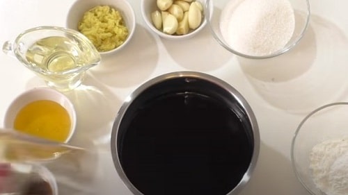 - Стільком людям крохмаль у воді, перелийте в соєвий соус. Додайте рисовий оцет, який допустимо замінити винним, якщо не знайдете. Покладіть імбир, ананасове пюре і сік, віджатий з свіжого фрукта.