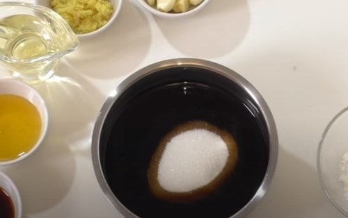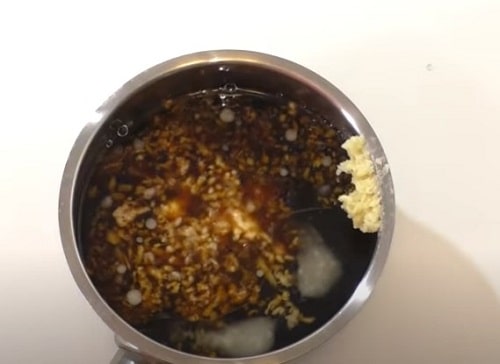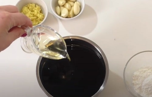 Влийте в каструльку соєвий соус, винний оцет, хлюпніть крапельку води, перемішайте.