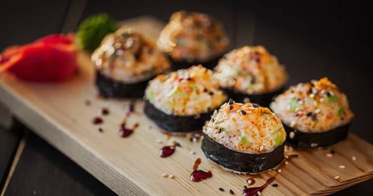 - Потім викладаємо тофу зверху рису, розрівнюємо, ще раз посипаємо сухими спеціями. Відправляємо деко на 15 хвилин у духовку при температурі 190 градусів. Сервіруємо на блюді з допомогою листя норі.