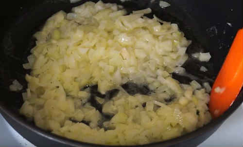 Розтопіть на сковороді шматочок вершкового масла, викладіть цибульну нарізку. Пасеруйте при частому помішуванні, поки кубики не стануть прозорими.