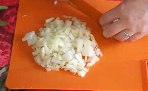 - Зубчик часнику і цибулину дрібно покришіть. Цибульні кубики складіть на сковорідку в розбещену вершкове масло. Трохи обсмажте, посипте цукром, щоб цибуля красиво зазолотился.