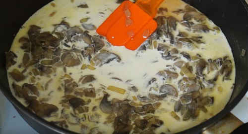 - Через пару хвилин спільної смаження, влийте вершки. Тушкуйте на маленькому вогні 20-25 хвилин, накривши сковороду кришкою.