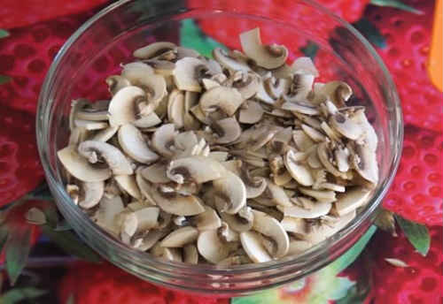 Обполосніть грибочки, видалити ніжки (їх допустимо залишити, але краще використовувати для приготування інших страв). Тонко наріжте капелюшки пластинами.