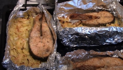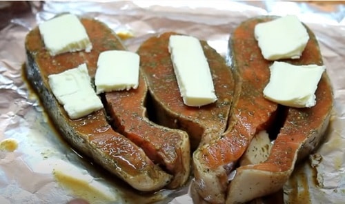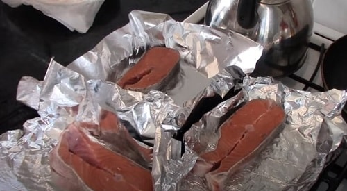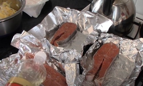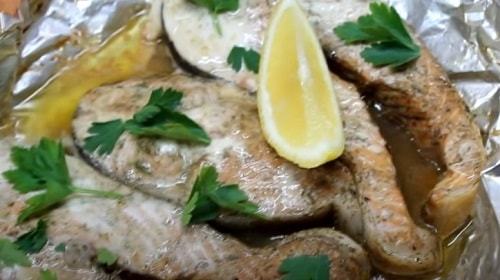 - Загорніть рибу, поставте в духовку, розігріту до 180-190 о С. Час приготування стейків з кети 25-30 хвилин. В кінці розгорніть фольгу, потримайте в печі хвилин п’ять, щоб верх рибки підрум’янився.