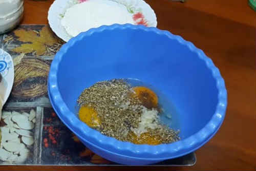 Розбийте в миску яйця, здобріть приправами, посоліть. Збийте до однорідності маси.