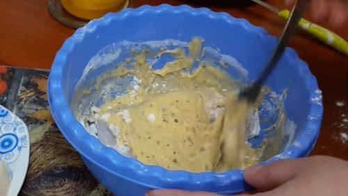 Засипте 2 ложки борошна, залийте молоко. Продовжуйте збивати, поки не розіб’ються грудочки, а тісто не стане густим, як для оладок. Борошно насипте на окрему тарілочку.