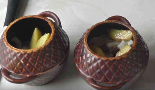 Вибір горщиків нині на будь-який смак. Великі і маленькі, широкі і високі. Але, щоб не зіпсувати блюдо, крім рецептів необхідно знати кілька нюансів в роботі з ними. Перед приготуванням неодмінно замочіть посудину в холодній воді хвилин на 15, щоб глина наситилася вологою. Якщо новий горщик, то й зовсім на годину. Ніколи не ставте керамічний посуд в розігріту духовку, прогрівайте її разом із заготівлею страви. А якщо в процесі доливаєте воду – додавайте гарячу, інакше глиняна посудина лопне. В запропонованій збірці ви знайдете декілька різноманітних варіантів запікання в духовій шафі – вибирайте і готуйте.