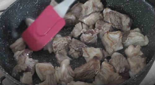 - Наріжте м’ясо яловичини шматочками, обсмажте до красивої рум’яності на сковороді.