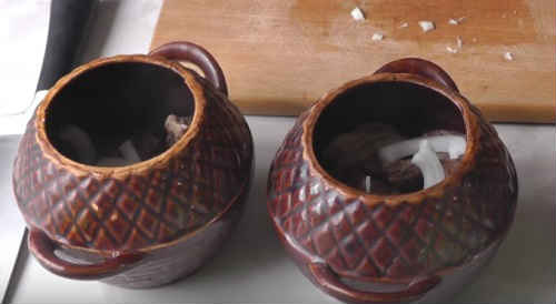 - Складіть в керамічний посуд по парі шматків м’яса, киньте трохи родзинок, гриби з цибулею, горішки.