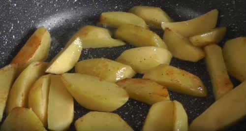 Начищений картопля поділіть великими часточками. Також надішліть на сковороду обсмажуватися. В процесі підсоліть і поперчіть.