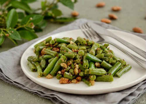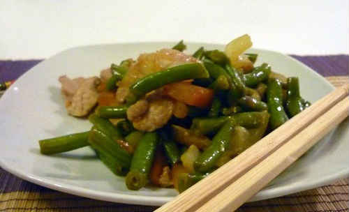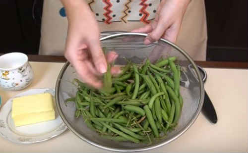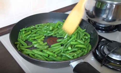 Це звичайна смажена зелена квасоля, з додаванням часнику. Можна використовувати свіжу або заморожену – смак страви не постраждає. Дуже важливо не переварювати стручки, інакше квасоля стане дуже м’якою. Хрустка смажена квасоля набагато смачніше.