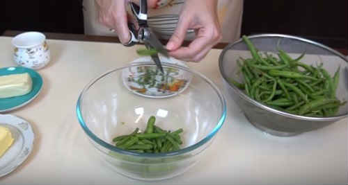 - Плесніть на сковороду ще ложку масла, покладіть порізану квасоля. Здобріть розмарином, обсмажуйте при постійному помішуванні 5-7 хвилин. Помітите, що колір квасолі почав змінюватися, відразу вимикайте, цього допускати не варто. Перекладіть в салатницю.
