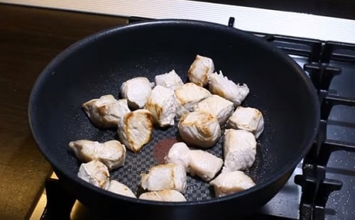 - Налийте на сковорідку масло, прогрійте. Викладіть курочку, смажте до м’якості м’яса. На все у вас піде 10-15 хвилин. не забувайте періодично перемішувати. В кінці приправте спеціями.