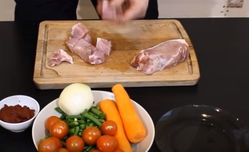 Промийте м’ясо, трохи підсушіть паперовими серветками. Наріжте свинину шматочками середнього розміру.