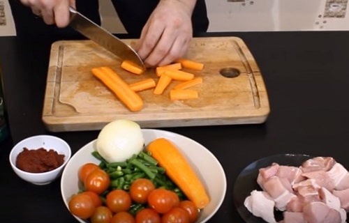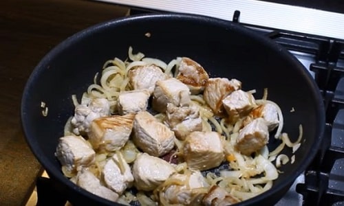 - Замість свинини викладіть порізану кубиками цибулю, терту моркву. Обсмажте овочі і відправте слідом за м’ясом.