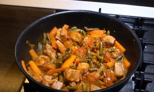 - Прикрийте сковорідку кришкою, тушкуйте на малому вогні близько 10-15 хвилин. Спробуйте на м’якість свинину, якщо вона ще жорстка, додайте час гасіння.