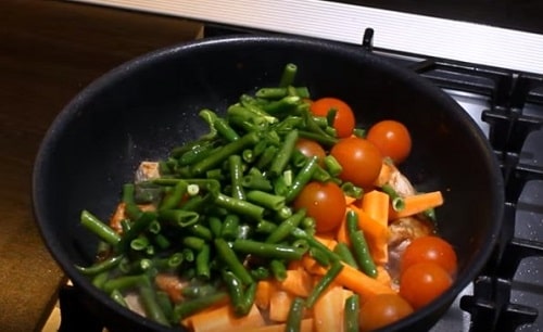 Закладіть на сковороду всі овочі, перераховані в складі рецепта. Черрі можна класти цілком або поділити навпіл. Якщо замініть їх звичайними помідорами, наріжте їх великими часточками.