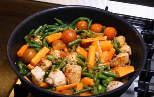 - Обсмажте на сковороді в добре розігрітій олії. Додайте овочі. Продовжуйте смажити, поки вони не зарум’яняться.