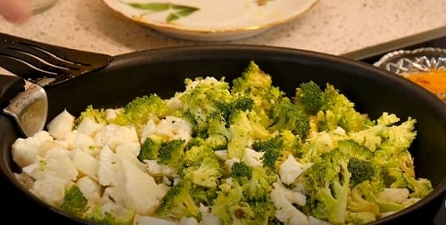 Покладіть брокколі і цвітну капусту. Перемішайте. Обсмажуйте, поки овочі не размягчатся. Не забувайте помішувати овочі.