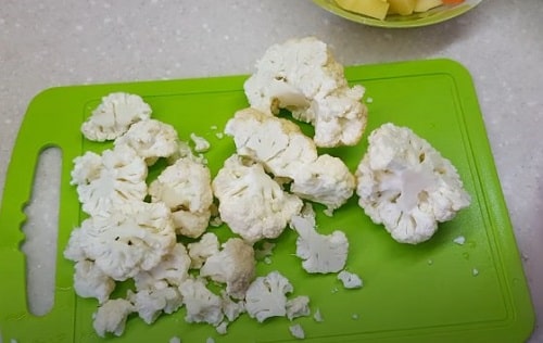 - Почистіть картоплю, поділіть кубиками середнього розміру. Розберіть качан цвітної капусти. Подрібніть цибулю.