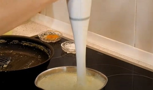 - Обсмажте на сухій сковороді муку до легкого потемніння. Трохи остудіть, розведіть 100 мл. молока. Дайте суміші закипіти.