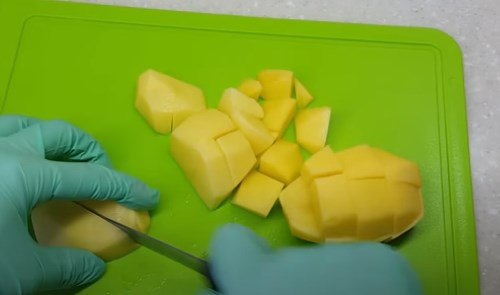 Почистіть картопляні бульби, поріжте великим кубиком.