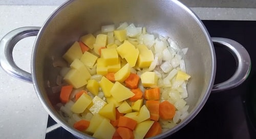 Додайте морквяні колечка і картопля. Продовжуйте готувати ще пару хвилин.