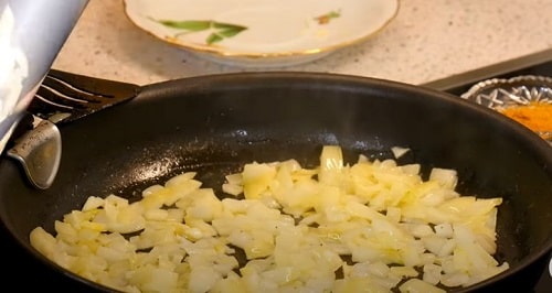 Викладіть лушпиння нарізку. Обсмажуйте на середньому вогні до легкої прозорості.