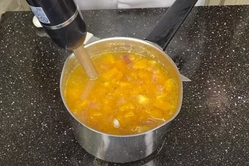 Відео-рецепт: суп-пюре з копченою ковбасою, гарбузом та сочевицею