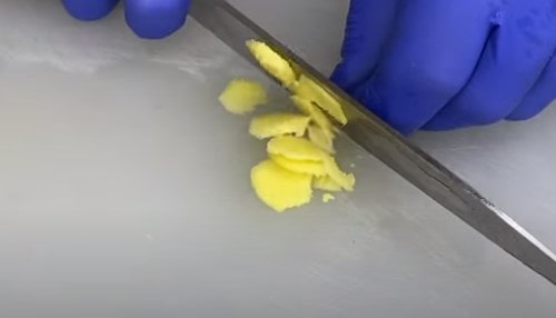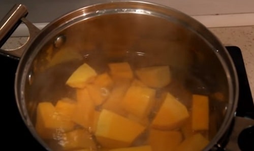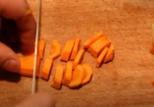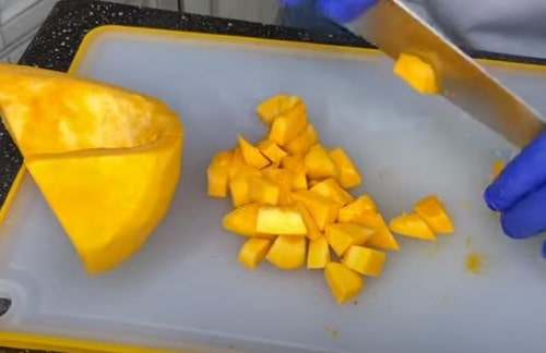 Паралельно наріжте м'якоть гарбуза шматочками.