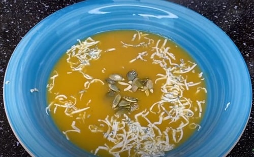 Налийте готовий суп-пюре в тарілку, посипте тертим сиром. У центр покладіть жменю гарбузового насіння – так подають страву у ресторані.