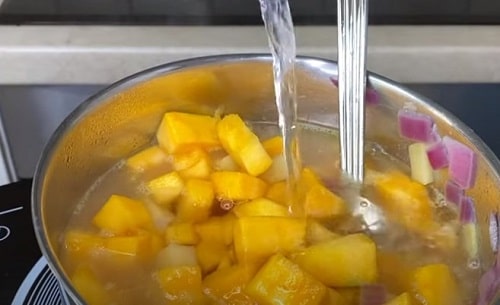 Надішліть кубики овоча в каструлю, розмішайте. Налийте води. Вона повинна повністю покрити овочі. Зробіть великий вогонь, закип'ятіть суп.