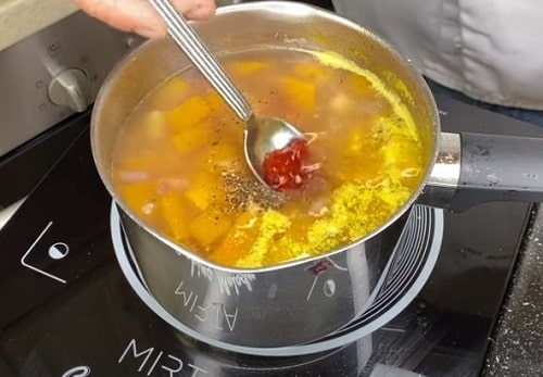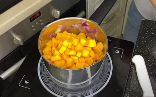 - Обсмажте до легкої рум'яності цибулю, додайте картоплю, кубики гарбуза. Влийте бульйон, заправте спеціями.