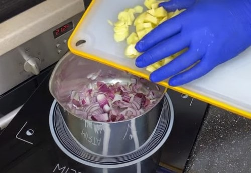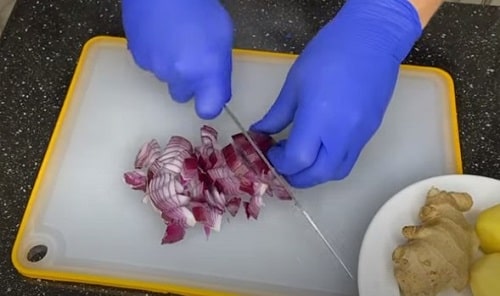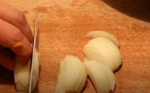 Покришите цибулину середнім кубиком, особливо не намагайтеся, оскільки далі овочі перетворимо в пюре.