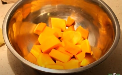 Тим часом займіться гарбузом. Зріжте шкірку, повністю видаліть насінну частину. Порубати м'якоть кубиками, як на фото.
