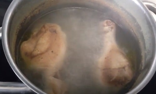 Зваріть курку до готовності, вийміть м'ясо, охолодіть, порубати шматочками.