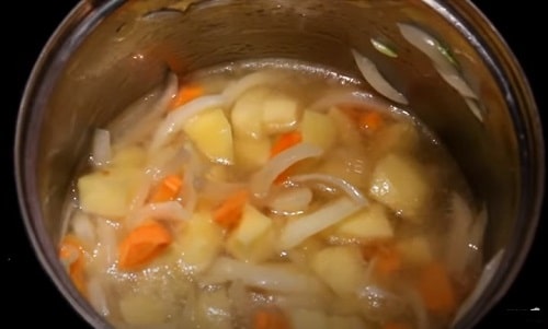 Розжарити в сотейнику масло. Спочатку відправте пасеровану цибулю, через пару хвилин покладіть моркву. Потім додайте картоплю, прожарьте овочі разом хвилин п'ять, не більше. Влийте воду, доведіть до закипання. Варіть овочі до м'якості (вода википить вся).
