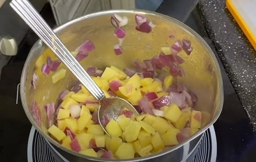 Додайте картоплю. Продовжуйте готувати ще 3-4 хвилини, не забуваючи перемішувати вміст.