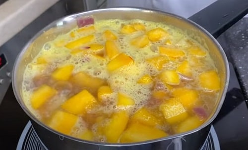 - Поверніть каструлю на плиту, додайте мускат, гострий чилі. Дайте страві закипіти, відразу вимкніть конфорку.