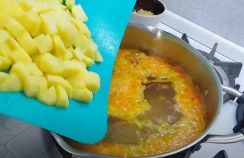 - Готуйте при відкритій кришці чверть години. Після додайте порізані кубиками бульби картоплі.