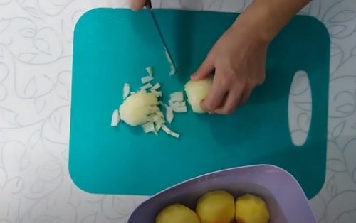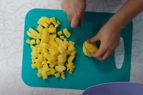 - Поки вода закипає, почистіть картоплю. Настрогайте кубиками. Відправте в каструлю.