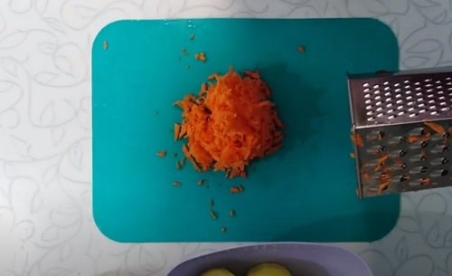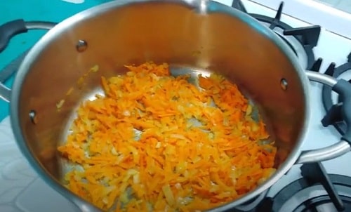 - Потріть моркву поріжте цибулину. Зробіть піджарку, заклавши спочатку цибульну нарізку, потім морквяну. Коли овочі зарум’яняться, вимкніть конфорку.